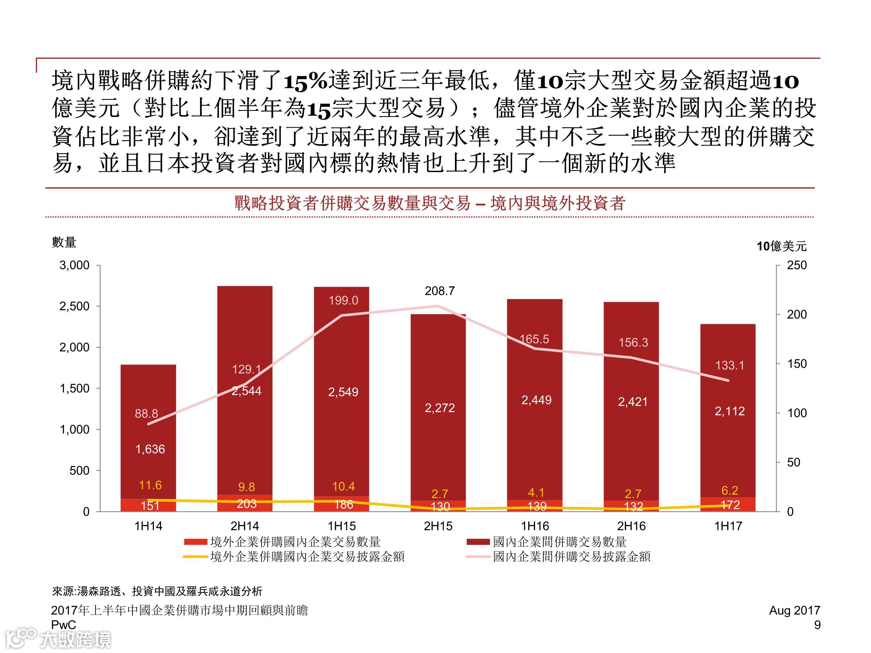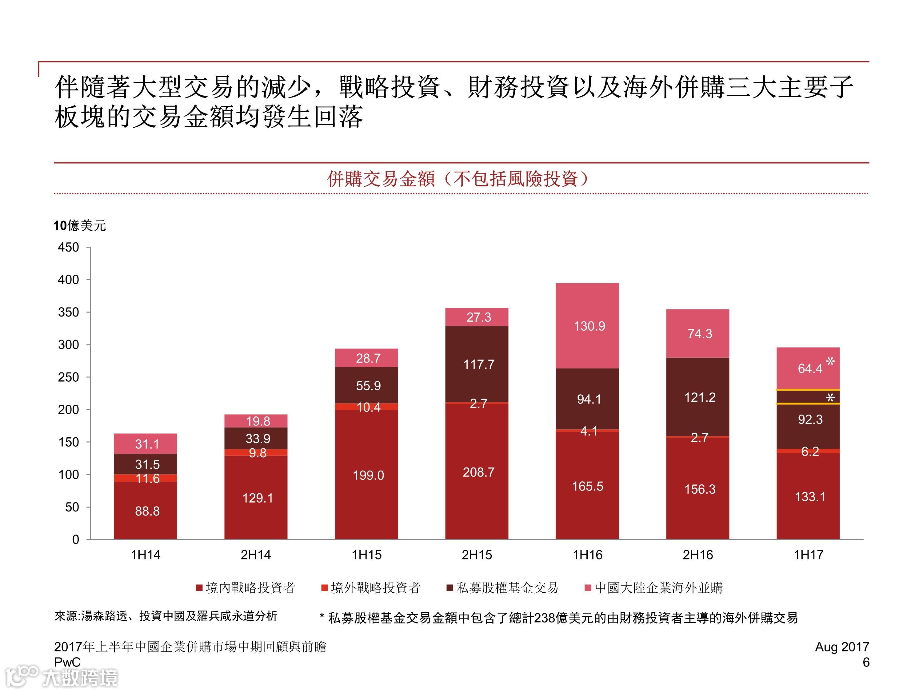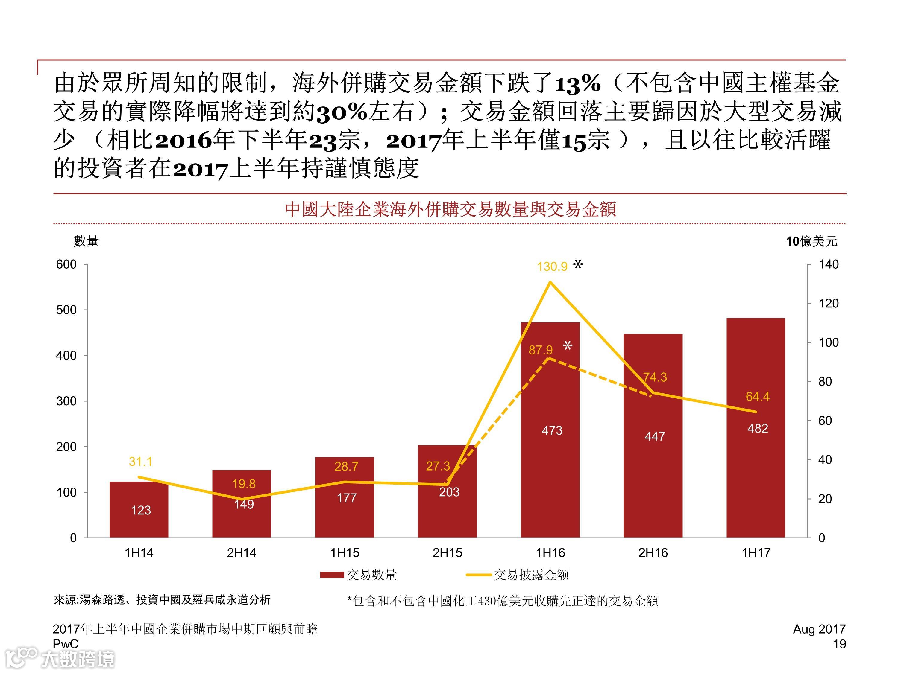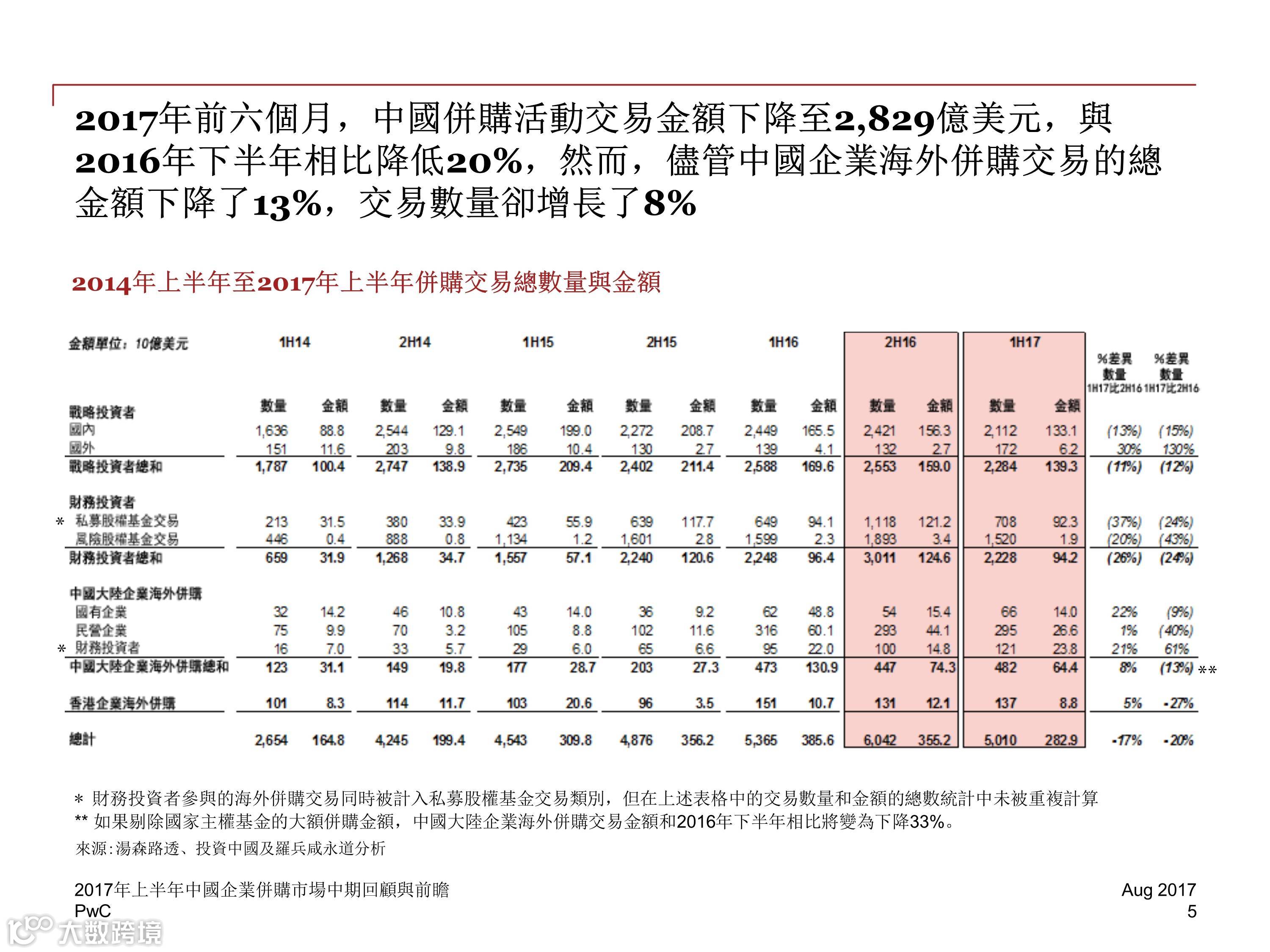 2017 年前六个月,中国并购活动交易金额下降至 2829 亿美元,与 2016 年下半年相比降低 20%,然而,尽管中国企业海外并购交易的总金额下降了 13%,交易数量却增长了 8%。