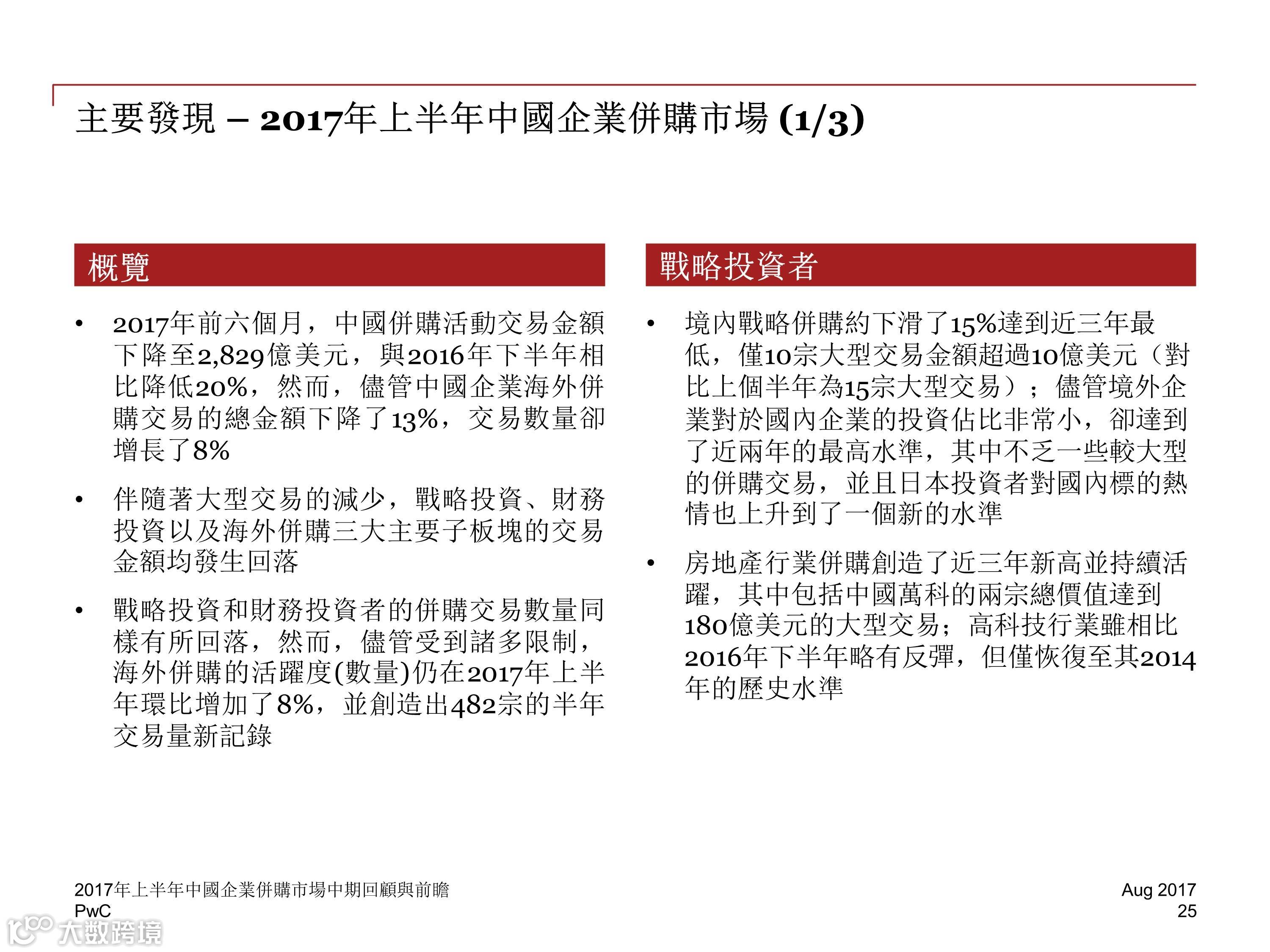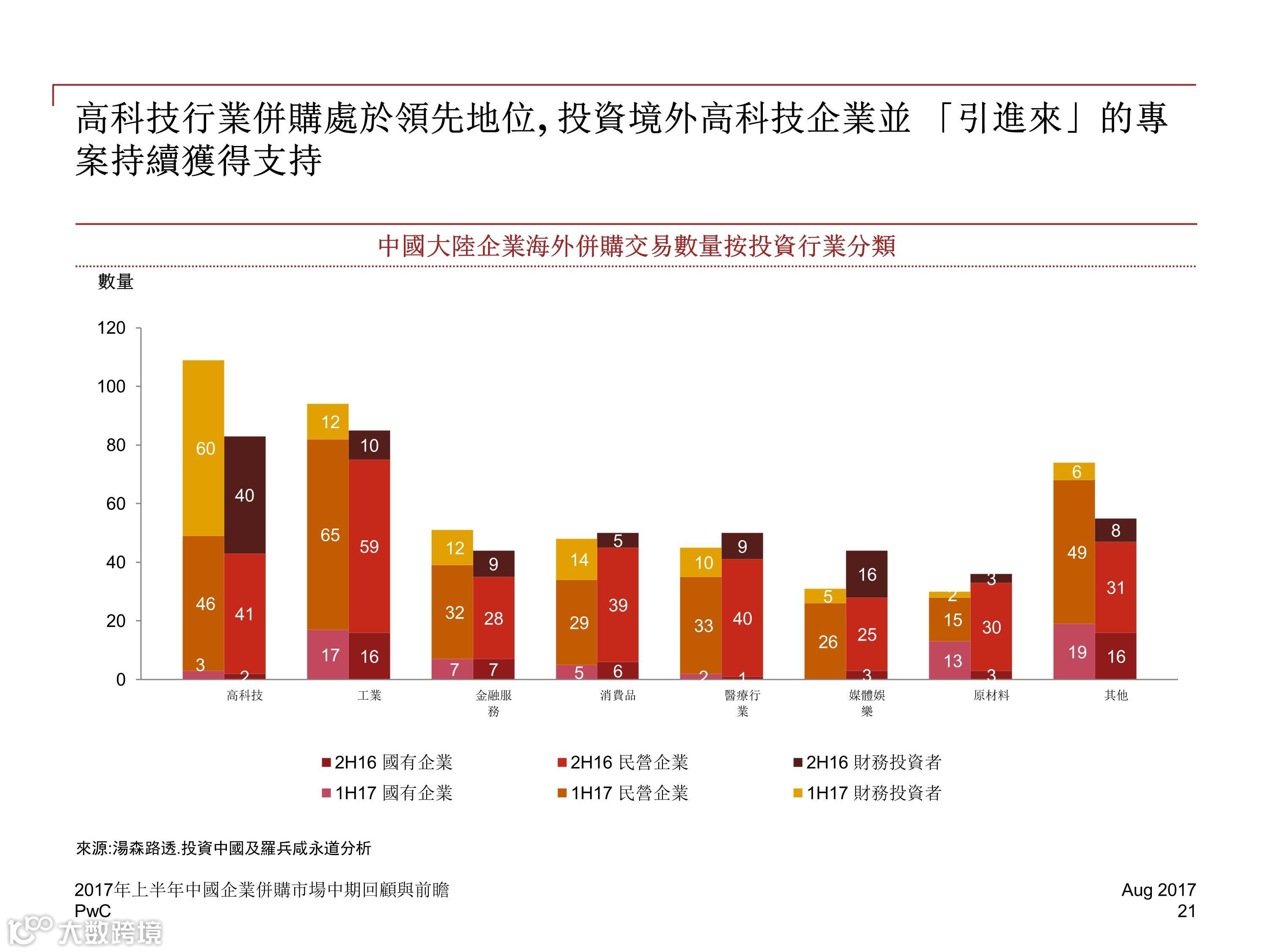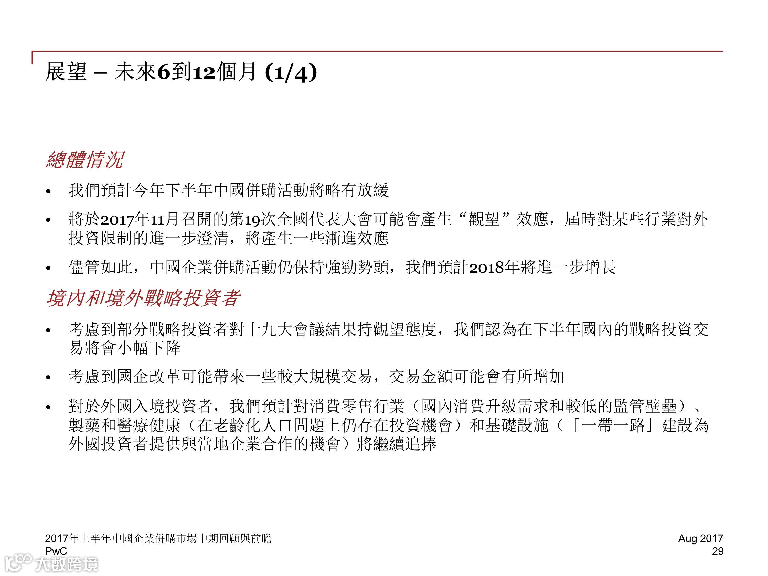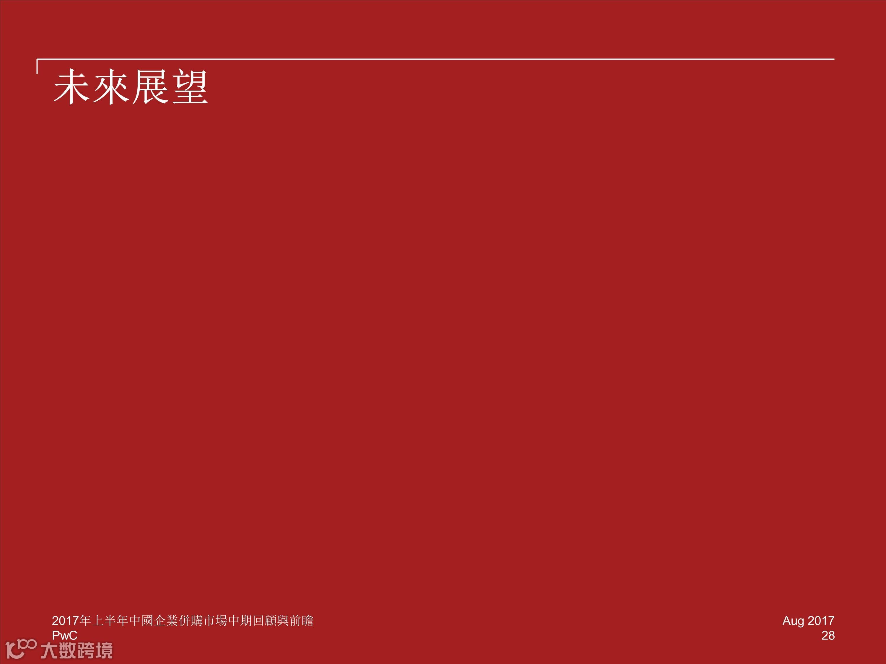 2017 年前六个月,中国并购活动交易金额下降至 2829 亿美元,与 2016 年下半年相比降低 20%,然而,尽管中国企业海外并购交易的总金额下降了 13%,交易数量却增长了 8%。