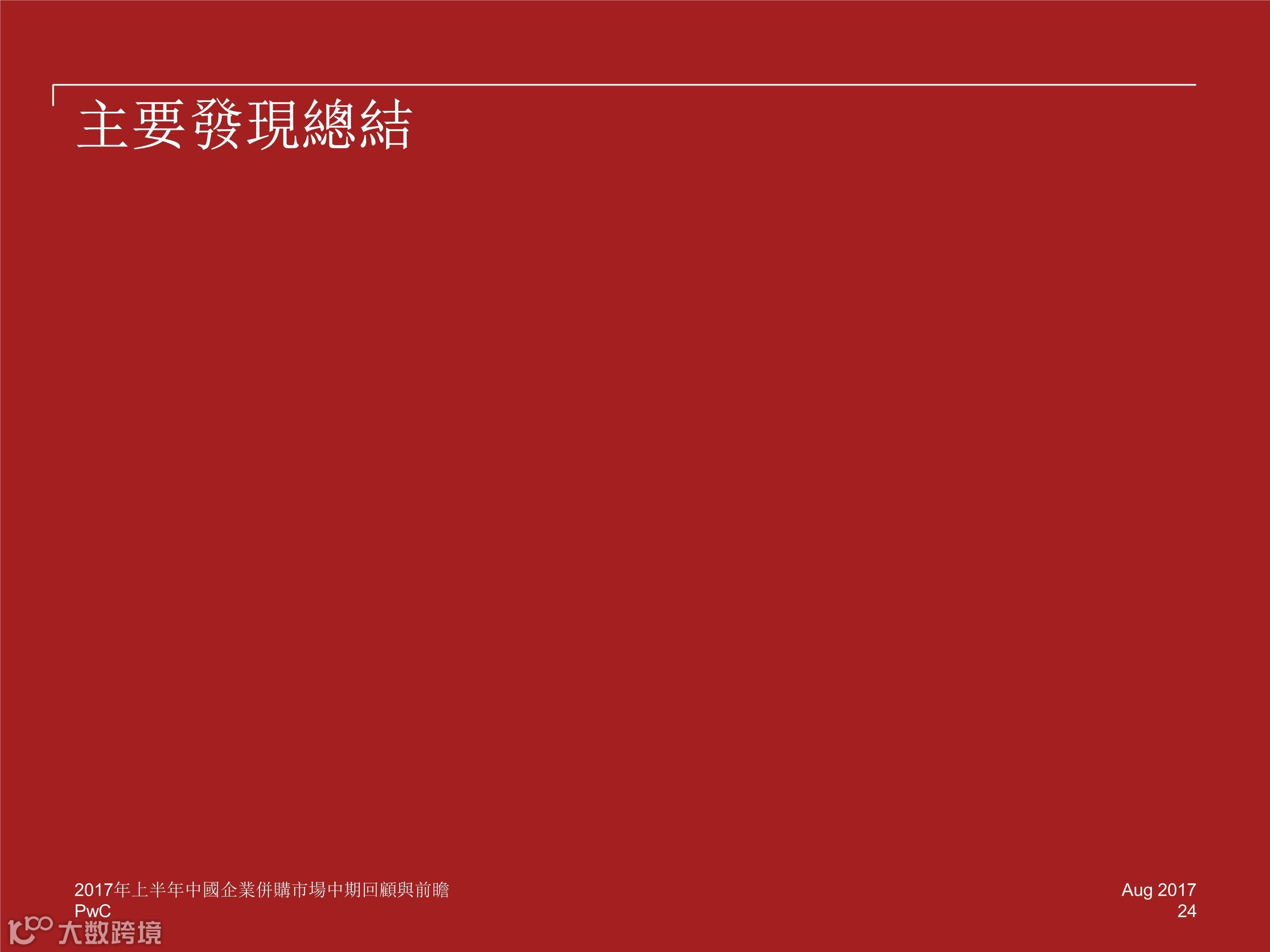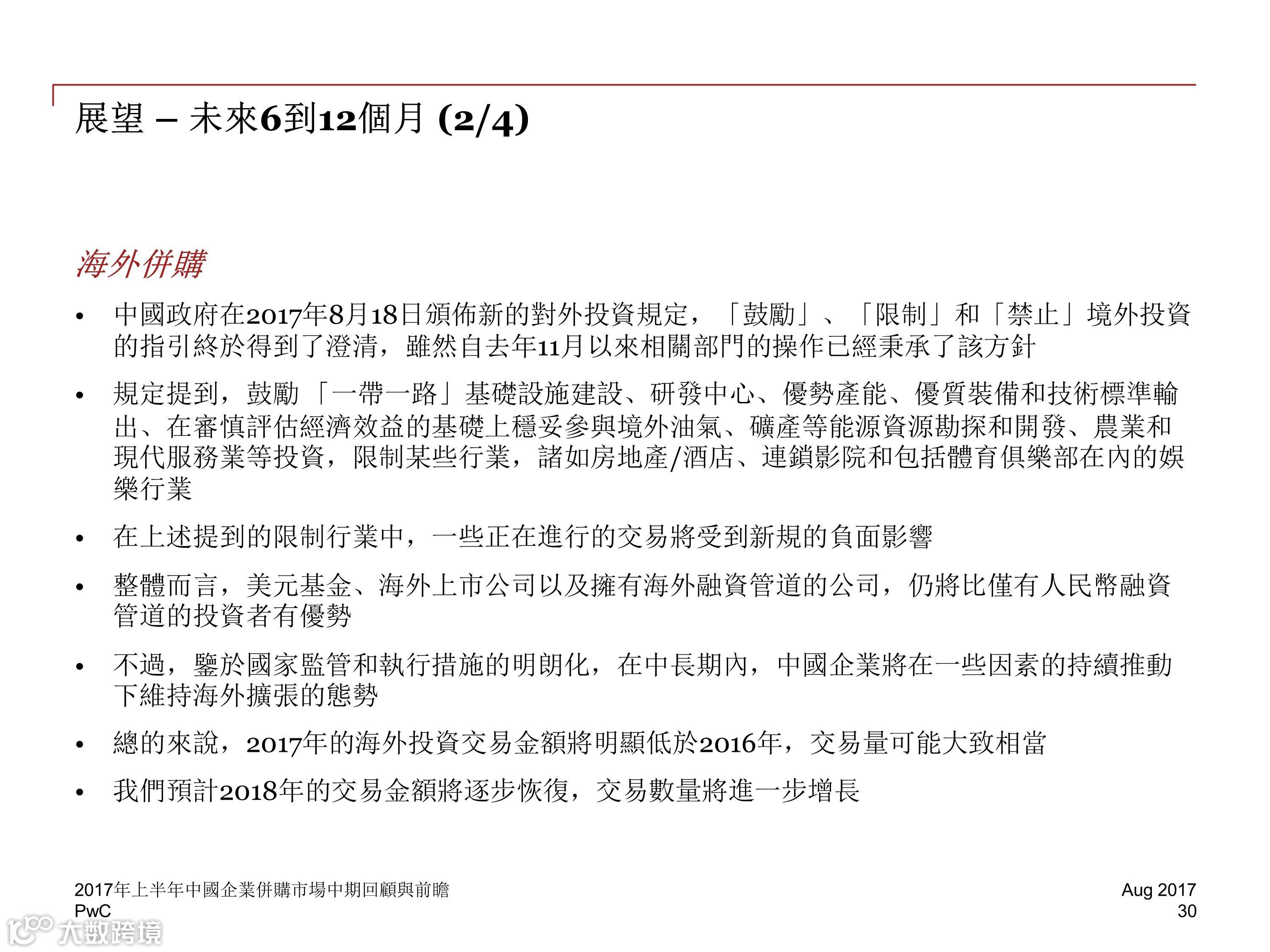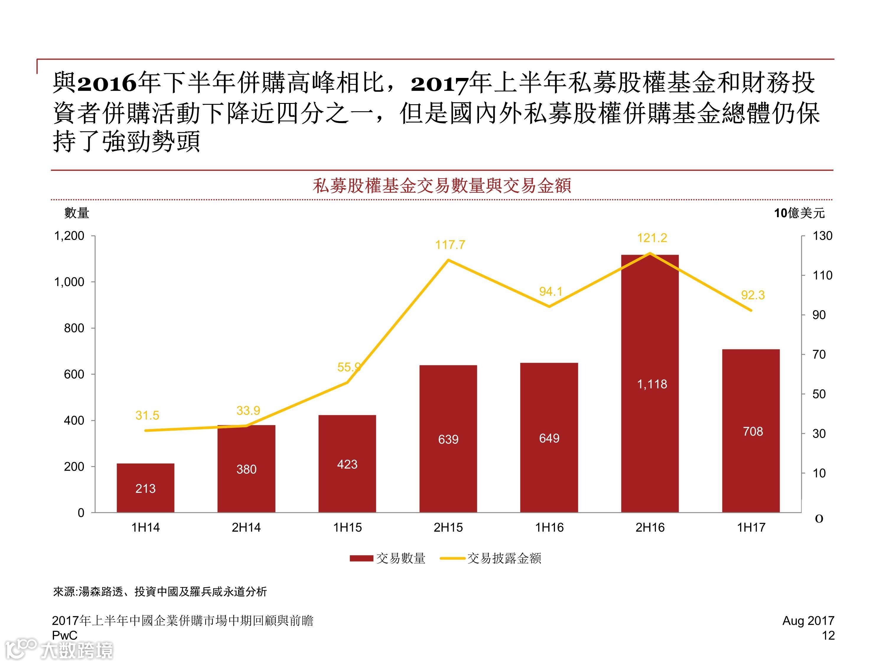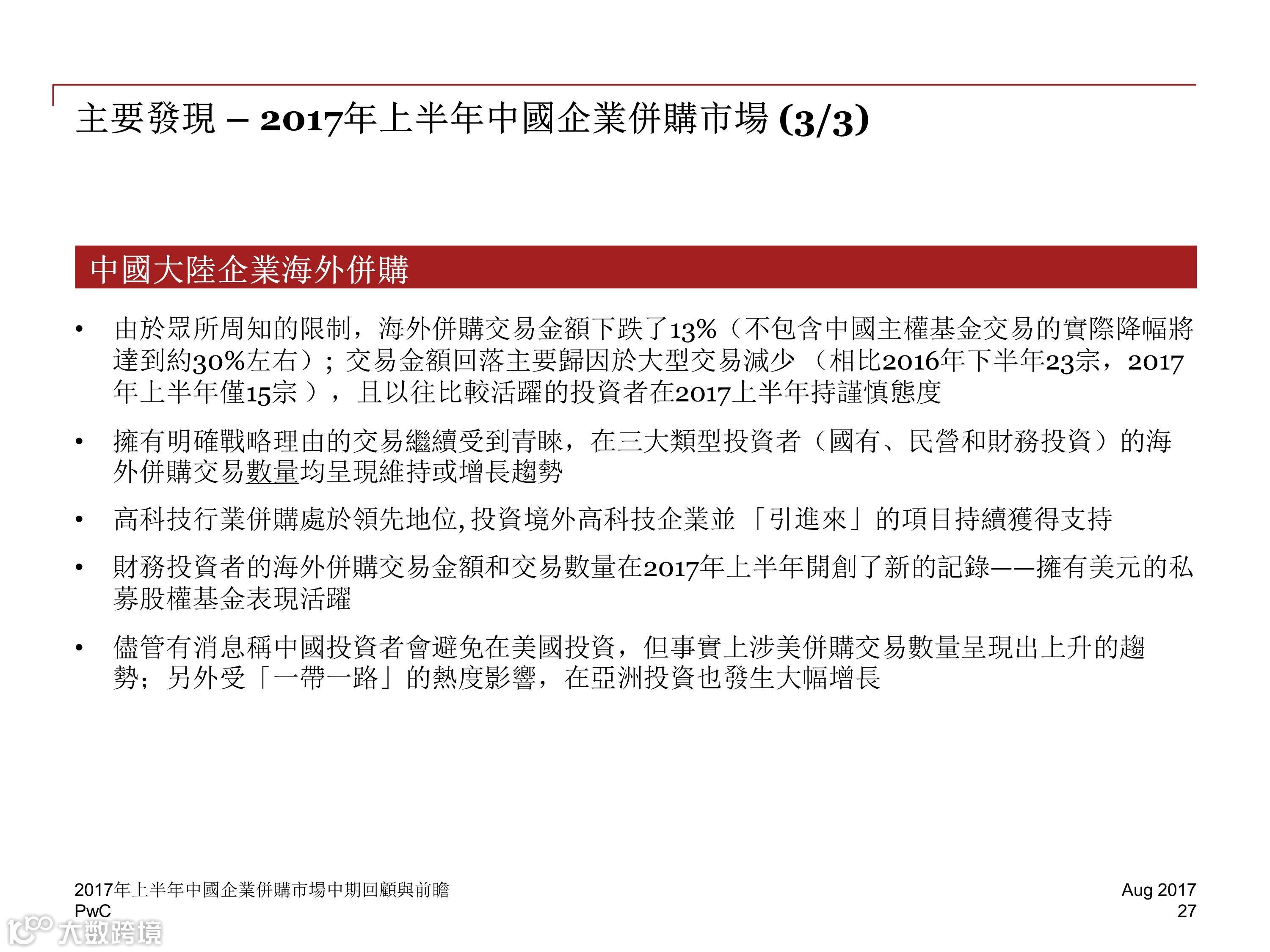 2017 年前六个月,中国并购活动交易金额下降至 2829 亿美元,与 2016 年下半年相比降低 20%,然而,尽管中国企业海外并购交易的总金额下降了 13%,交易数量却增长了 8%。