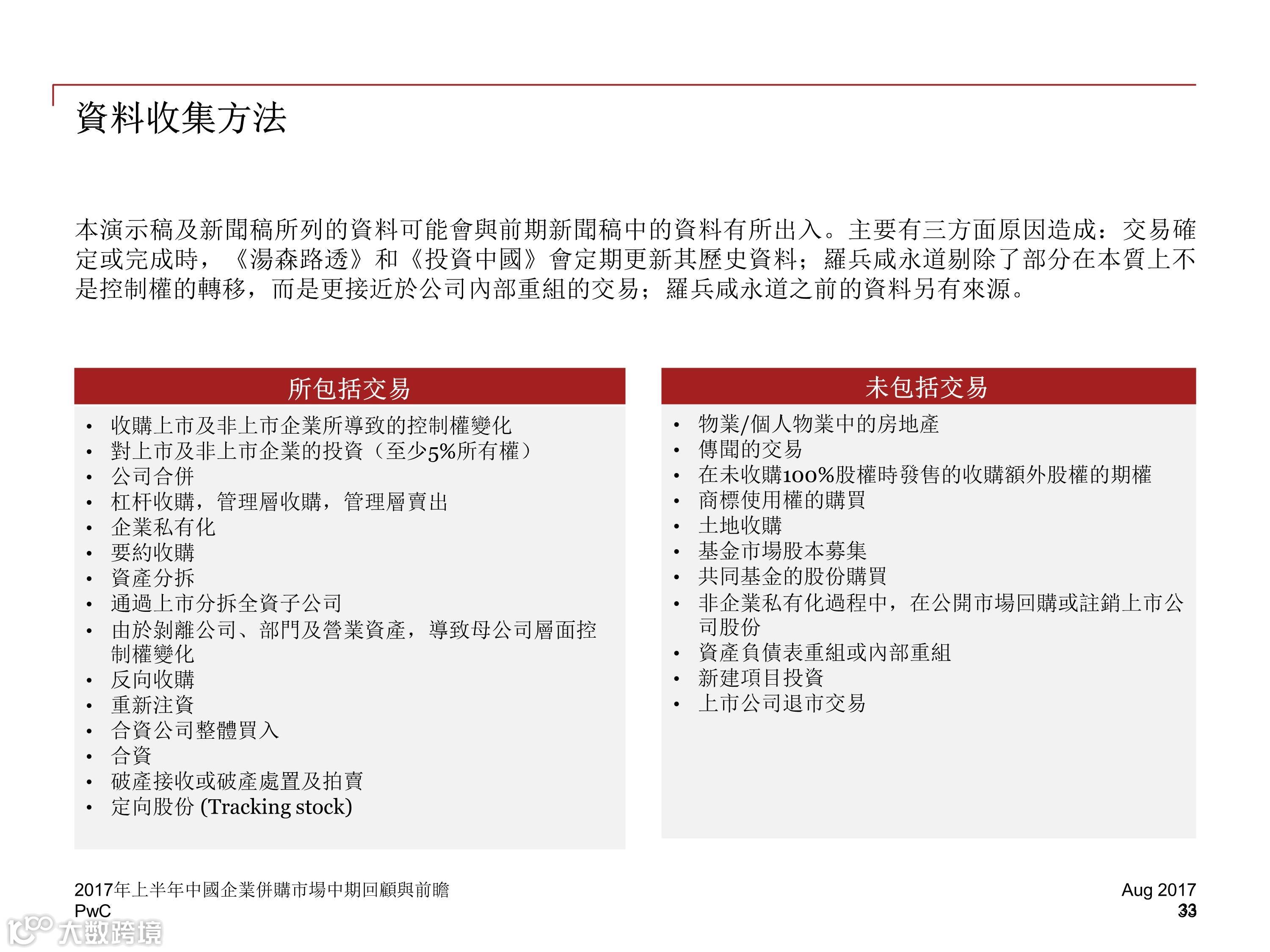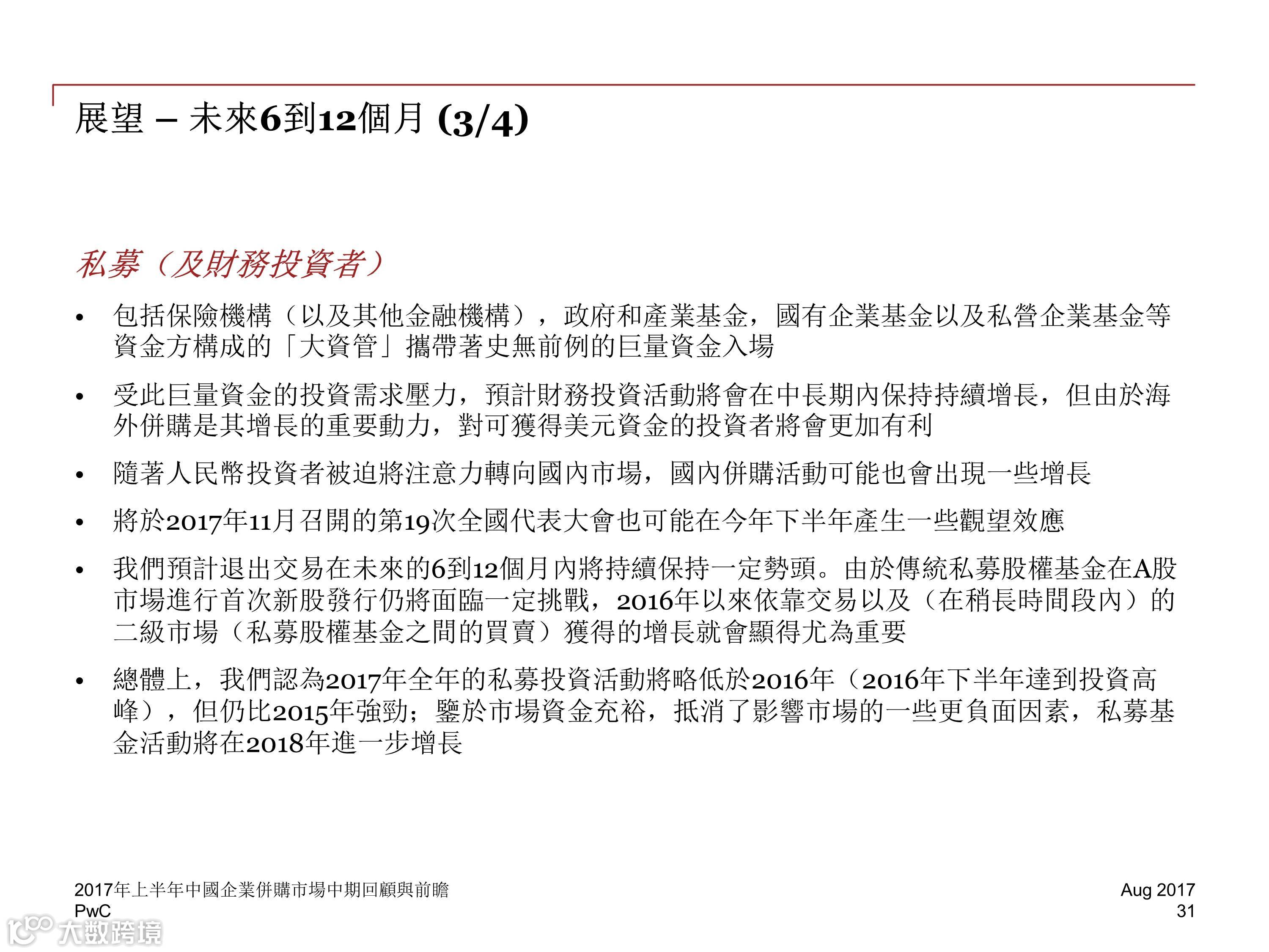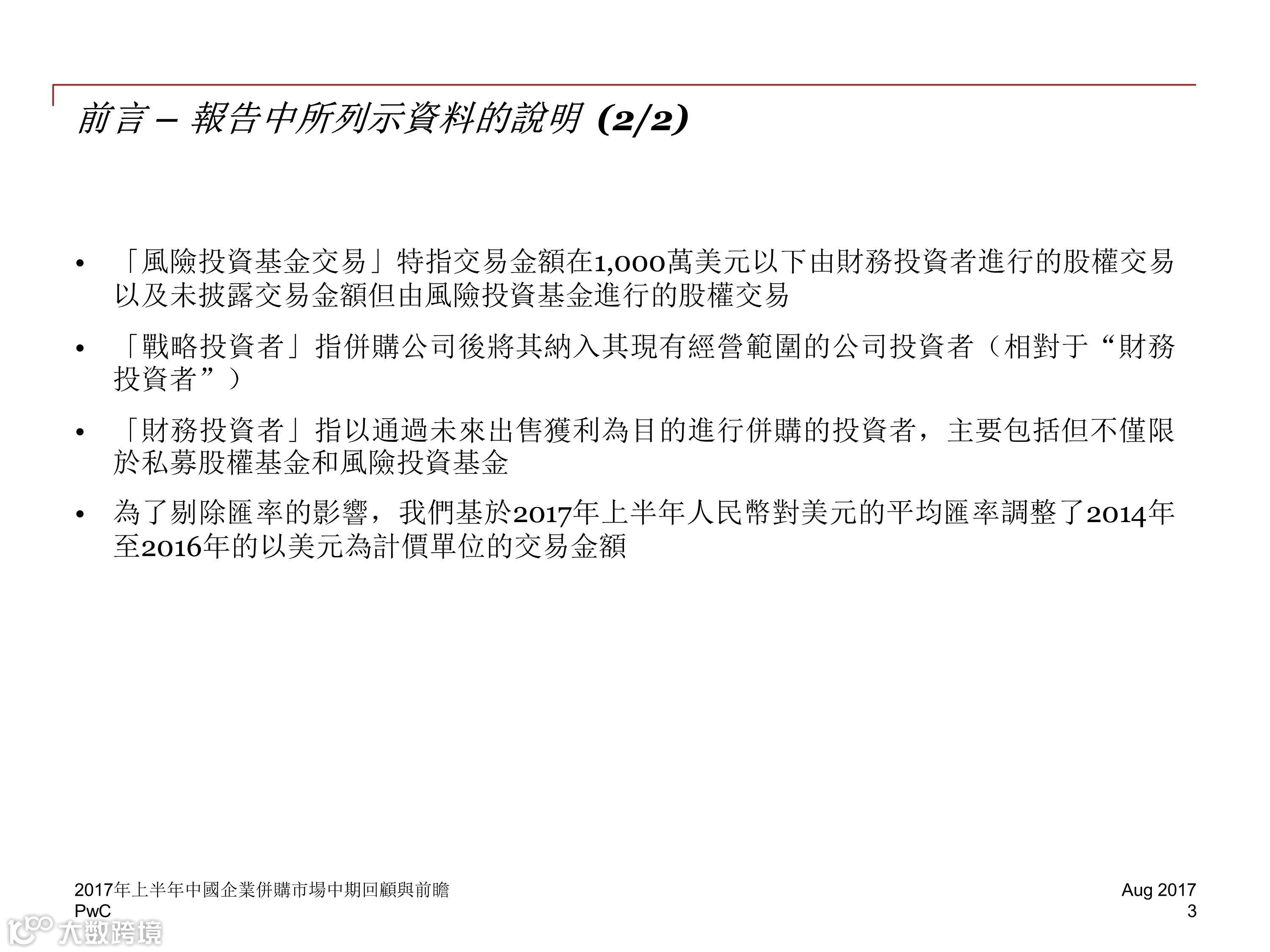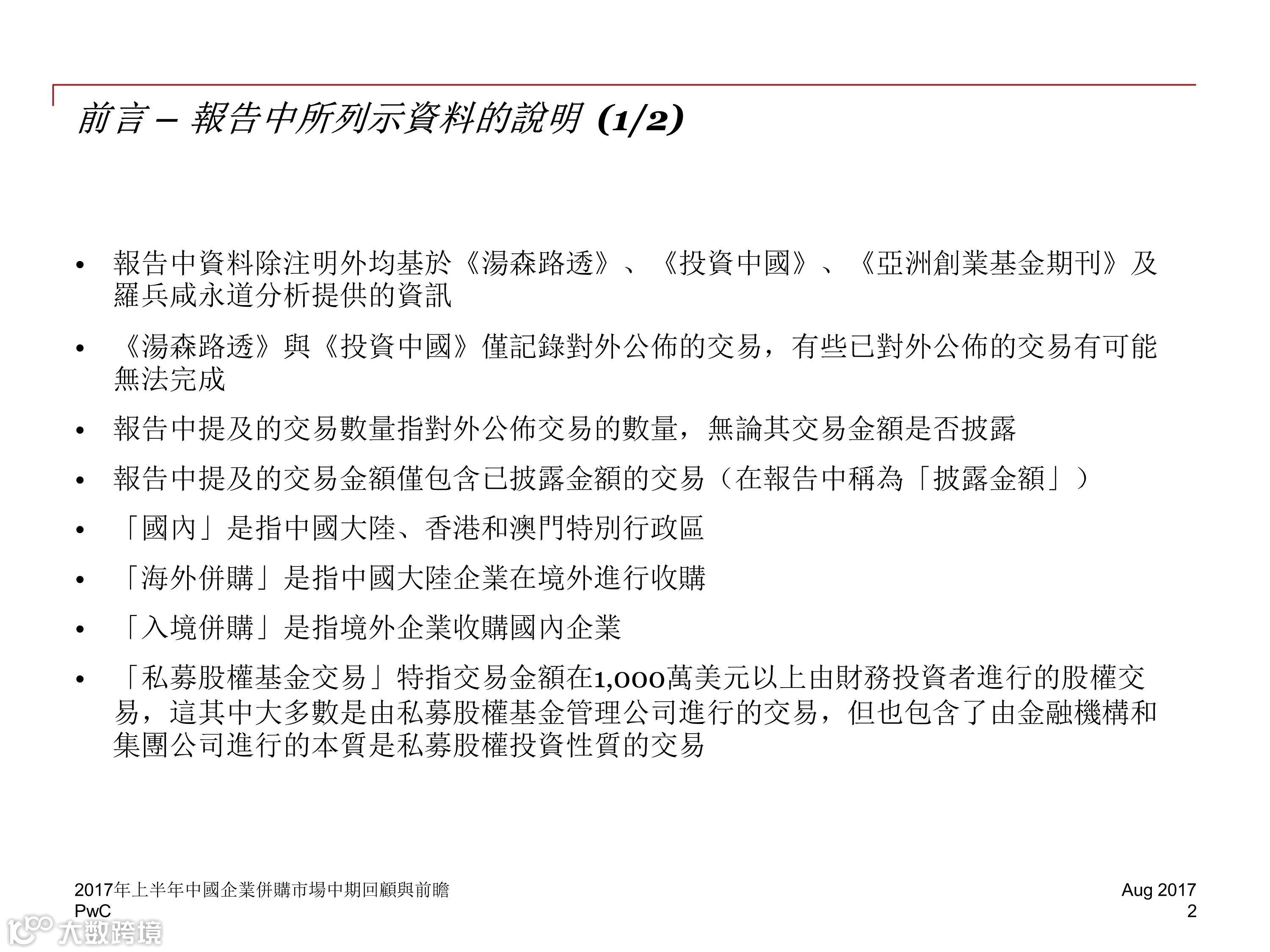2017 年前六个月,中国并购活动交易金额下降至 2829 亿美元,与 2016 年下半年相比降低 20%,然而,尽管中国企业海外并购交易的总金额下降了 13%,交易数量却增长了 8%。