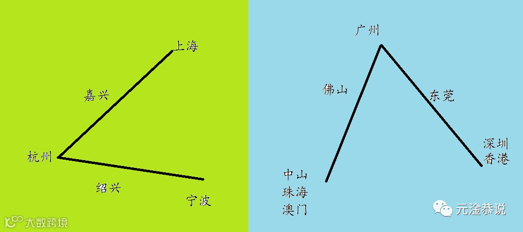 从各个城市的相对位置来看,珠江口和杭州湾非常相似,杭州和广州分别是区域内老牌的中心城市,和杭州、广州相对位置类似的上海、香港则是在1842年开埠之后逐渐发展成型。区域内大体上都存在三个核心区和两个介于三大核心区之间的走廊地带,把杭州湾这幅图顺时针旋转90度,大体就是珠江口。