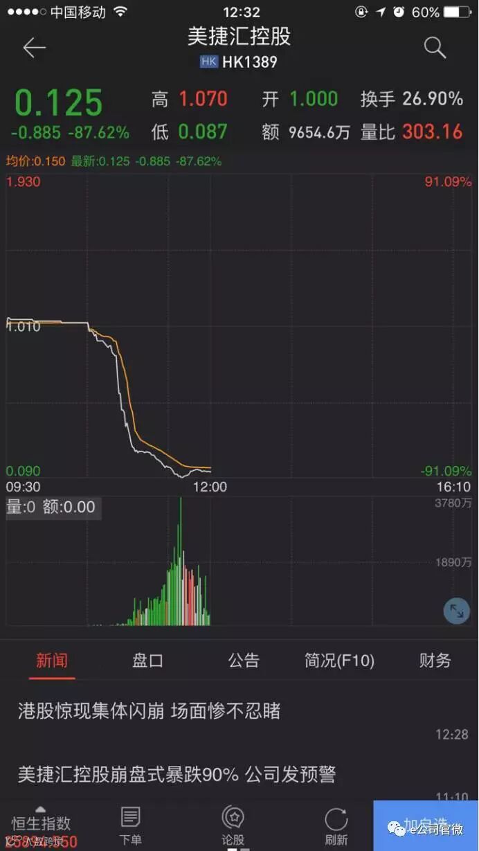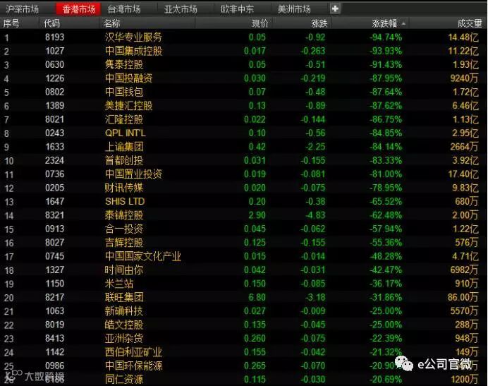 跌的最多的汉华专业服务,开盘价0.97港元/股,之后虽然一路走低,但直到10:38突然跳崖式下跌,至午间收盘仅剩0.051港元/股,跌幅94.74%。汉华专业服务今天也放出天量,成交金额突破1亿港元。