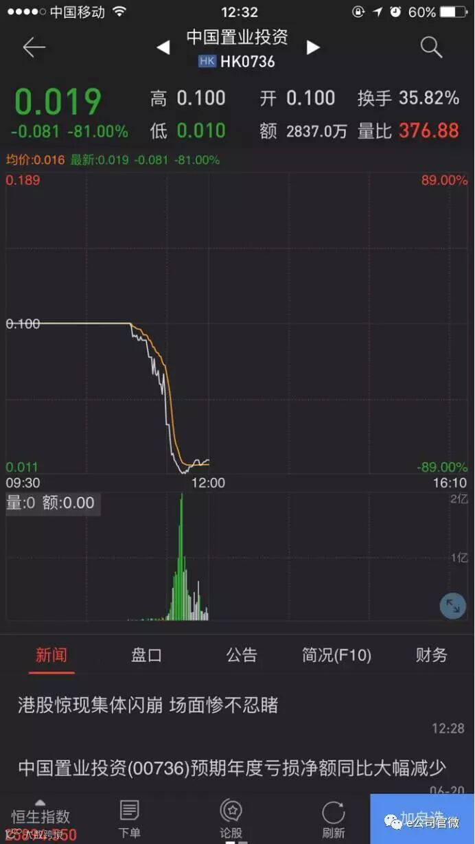 又比如中国置业投资,最低时股价仅剩0.011港元/股,至午间收盘的跌幅是81%,价格0.019港元/股。