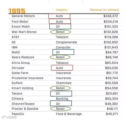 (上个世纪90年代中期,零售业获得发展的春天,但巨头依旧是原油和汽车)