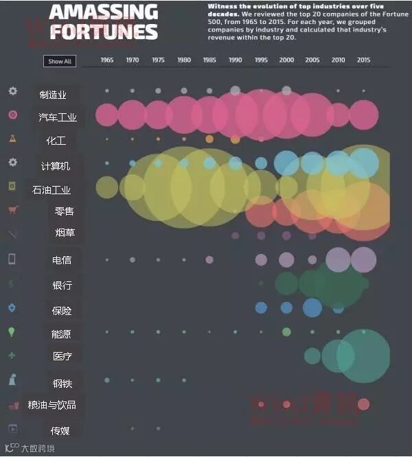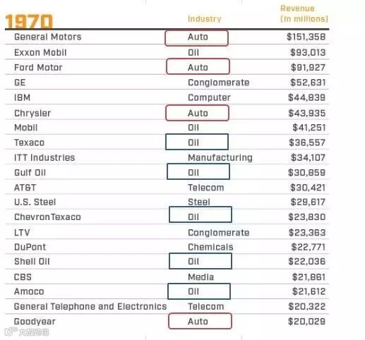在50年的大部分时间里,汽车和石油工业占据主导地位,特别是通用汽车在财富500排行榜上常独占鳌头。到2015,汽车和石油工业不再是美国的主导者。通用汽车在财富500排名下降到第六位。落后于新兴行业巨头,如沃尔玛,苹果和伯克希尔哈撒韦。