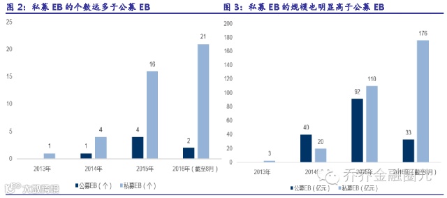 为什么最近私募EB 重获市场关注?我们认为,可交换私募债最近重获市场关注与7 月27 号的银行理财新规和证监会限制减持规定密不可分的。(1)2016 年7 月27 日银行理财新规对银行以前的高风险资产投资作了限制,资产荒背景下,银行等大型资产配置机构难以找到相对高收益的低风险资产进行配置,相比之下可交换私募EB 债受益优势明显。例如,目前已经发行的45 只可交换私募EB 中,发行利率超过4%的就有29 只,票息收益率明显高于同期国债收益率。(2)私募EB 可作为规避减持新规的工具。进入转股期后,如果最终投资者执行换股权,这种以发行可交换债形式换股减持属于被动减持,不受监管层减持规定限制。(3)多因素共同推动下,近期EB 发行出现井喷。仅7 月中旬以来,就至少有28家公司有可交换债发行意向,而过去3 年发行的EB 不到50 只。