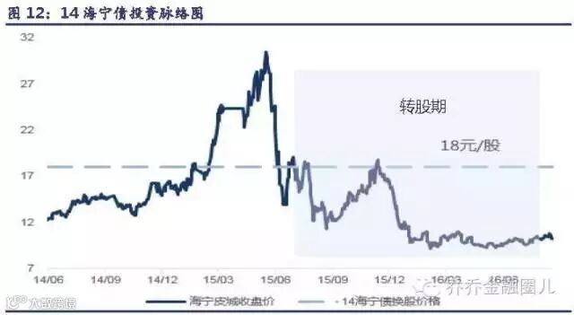 (1)14 海宁债是海宁皮城的第一大股东海宁市资产管理有限公司在2014/7/31 发行的一期可交换债,转股期为2015/8/3~2016/07/27,即使转股也不影响发行人大股东地位。其高发行溢价率、高票息(7.3%)、无下修条款和换股期前有赎回条款均表明发行人换股意愿弱。