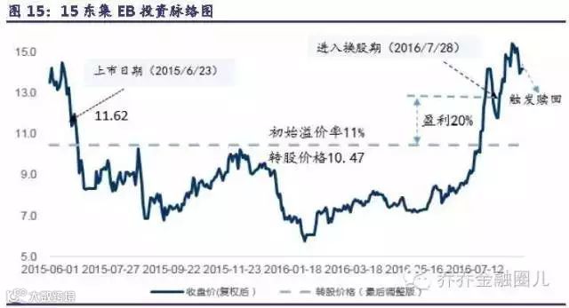 其中,15 东集EB 转股价较起息日收盘价折价11%,同时,这支EB 债下修条款也很特别,进入换股期前10 个交易日中至少有5 个交易日的收盘价低于初始换股价70%就可以自动下修,这些特征表明发行人减持意愿相对较强。