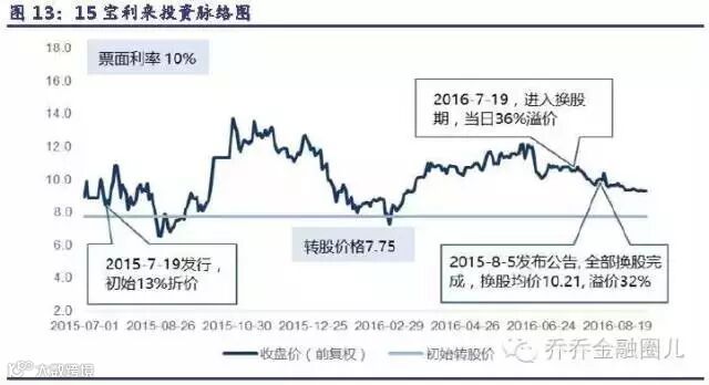 (1)15 宝利来是神州高铁的第三大股东宝利来实业有限公司在2015/7/19 发行的一期可交换债,转股期为2016/7/19~2016/11/17。这个案例的特别之处在于票息高达10%,初始转股价格较发行当日收盘价就有13%的折价。同时这期可交换私募债没有设置任何下修、赎回和回售条款,股价上涨带来的博弈空间大。