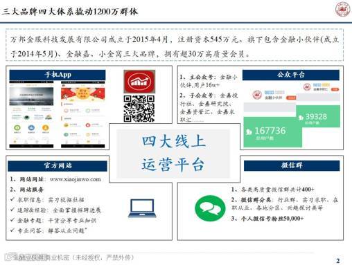 公司旗下包含金融小伙伴、金融嘉、小金窝三大品牌,拥有超30万高质量会员,覆盖美英等国以及中国20多个省市区,在海内外金融学子中享有盛誉。公司创始人团队均拥有名校硕士背景及券商、基金等工作经历,至今已与超过500家国内主流金融机构开展了合作。