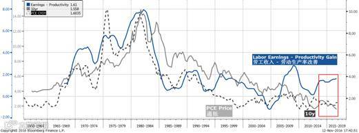 在宏观经济学家的眼中,在图表1里叠加另外一个变量之后,十债收益率勾勒出了一副不同的画面。在图表2中,我们发现,劳动者薪酬的增长和劳动生产率改善之间的缺口也是通胀压力的阀门。一个变窄的缺口,如图表2所示,意味着劳动产出的增速大于投入,即劳动者并没有得到与其生产率改善相匹配的、合意的劳动补偿。简单的说,这个变窄的缺口记录了在过去三十多年间劳动者的剩余价值被剥削的历史,是三十多年来持续低通胀的根本原因。