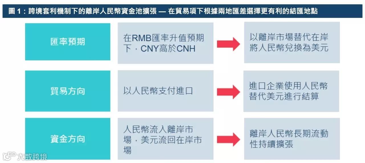 在结算过程中,境内外进出口商根据汇率波动,相应利用人民币及美元进行不同地点的结算,从而推动离岸市场人民币池不断扩大,机制具体表现为:当人民币汇率处于升值预期时,香港离岸市场美元兑人民币汇率(CNH)较境内市场美元兑人民币汇率(CNY)升值更为明显。CNH升水意味着离岸市场人民币价格更贵,企业使用人民币进行进口贸易结算能够获取额外收益,因此有动力通过对进口支付人民币取代美元,导致境内人民币流动性外溢至境外。