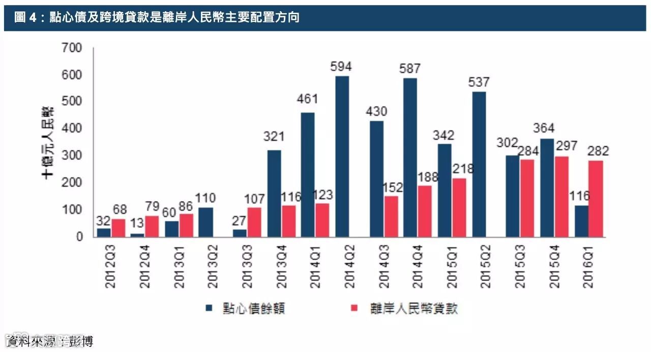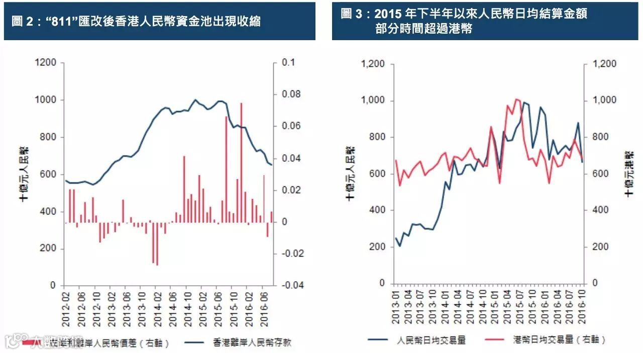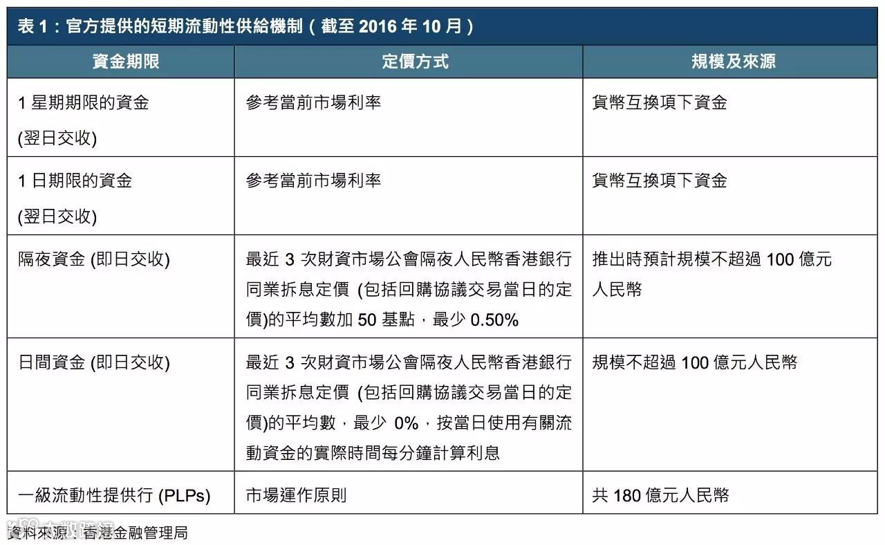 短期流动性方面,离岸市场的人民币资金供应管道分为官方及市场融资两个层面。官方提供的短期流动性,包括香港金融管理局(金管局)向市场提供的一日及一周期限流动资金安排(两者均为翌日交收),以及隔夜流动资金安排(即日交收);2014年为回应沪港通的开通,香港金融管理局又推出每日上限100亿元的拆借资金,以满足沪港通开放后离岸市场对人民币的即时需求。
