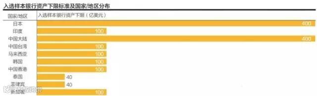 中国内地银行首次占据了亚洲排名前四位。另外,进入前15名的银行还包括2家中国香港的银行、1家日本的银行、1家泰国的银行、1家印度的银行。