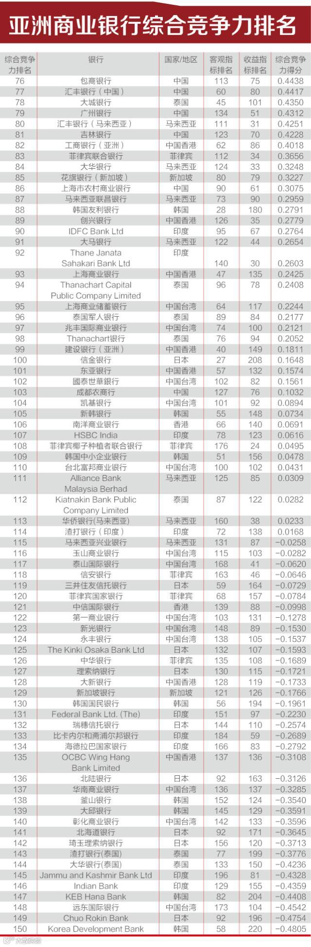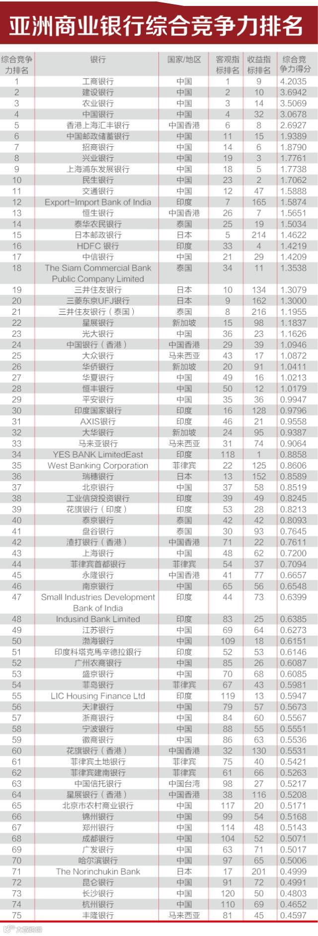 其中,中国工商银行保持了综合竞争力、客观指标两项第1名的位置,收益指标位于第9位;中国建设银行综合竞争力第2名,客观指标第2名,收益指标排名上升到第10位;中国农业银行综合竞争力第3名,客观指标第3名,收益指标上升到14名。香港上海汇丰银行综合竞争力排名第5名,客观指标排名第6名,收益指标排名第8名;中国邮储银行综合竞争力排名第6位,客观指标排名第11名,收益指标排名第15名;招商银行综合竞争力排名第7名,客观指标排名第14名,收益指标排名第6名。收益指标排名第一的银行为印度的 YES BANK Limited,其综合排名位列亚洲第34位。(编辑:闫沁波)