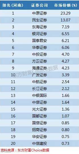 中原证券是河南本地券商,占据市场份额23%,民生证券在河南具有较大的布局,市场份额也比较高为13%。