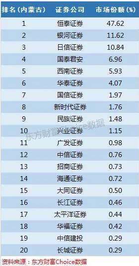 恒泰证券前身为内蒙古证券,如此一说便知它占据47.62%的份额是怎么回事,银河证券占据11%的份额,日信证券同样是内蒙古本地券商,前身为内蒙古日信证券,市场份额超过10%。