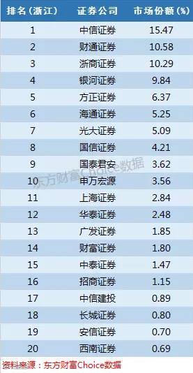 别看中信证券以15.47%的份额排名第一就以为浙江不是本地券商的天下,实际上这里的中信证券是子公司中信证券(浙江),另外两家本地券商财通证券和浙商证券分别也获得了超过10%的市场份额,除此之外,银河证券也有接近10%份额,方正证券、海通证券、光大证券市场份额也超过5%。