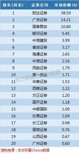 财达证券前身是河北财达证券,本地市场份额38.59%遥遥领先于同行,另外广发证券和国泰君安都有超过10%的份额。
