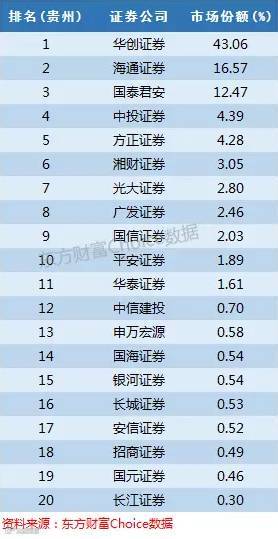华创证券是贵州省内唯一的国资控股证券公司,市场份额为43%遥遥领先。海通证券和国泰君安在贵州也有不错的份额。