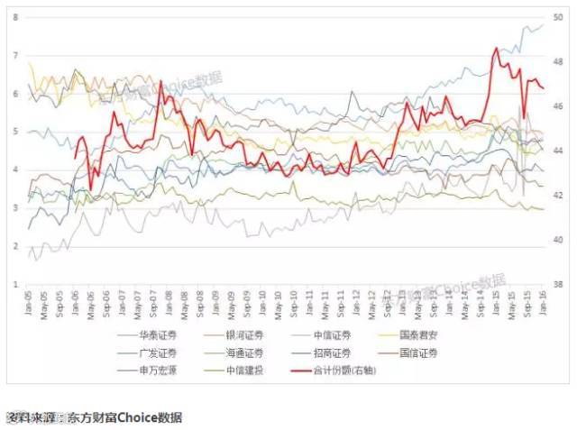根据资料,排名前十的证券公司占据4成以上的市场份额,从历史走势看,呈现出牛市份额增加,熊市份额减少的情况,究其原因,应该在于新股民比较愿意相信大型券商,在牛市到来之际纷纷到大券商开户交易,而当熊市来临之时也会快速离开市场。