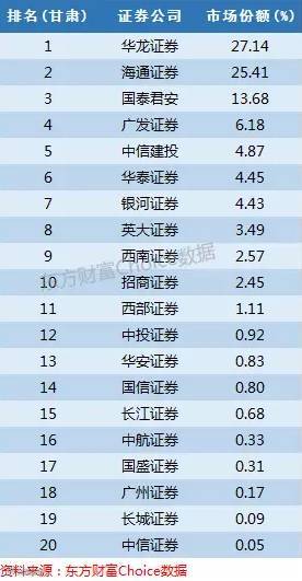 华龙证券是甘肃省人民政府筹建的本地券商,市场份额27%,海通证券由于托管了甘肃证券获得了25%的市场份额。