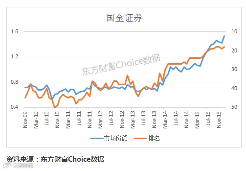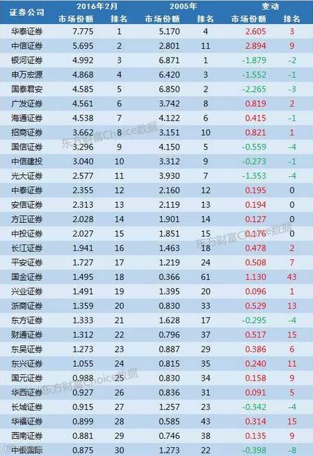 仅以股票经纪业务算,2005年市场三巨头是银河证券、国泰君安、申万宏源,分别占有超过6%的市场份额。十年之后,以2016年2月股票成交金额计算的市场份额,大型券商的排名变动并不大,基本上都属于正常波动;但是表现在份额上,老三巨头份额下降明显,而华泰、中信份额增加较多。中小型券商的市场份额和排名变动则非常明显,特别值得指出的是国金证券和西藏同信证券排名上升幅度明显,都是与互联网深度结合的券商。