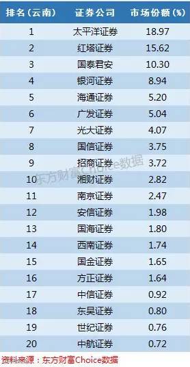 太平洋证券和红塔证券是云南的本地券商,市场份额分别为18.97%和15.62%排名前两位。