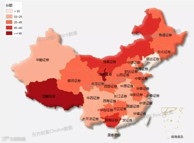 看地图,更直观!各地的龙头券商一览无余,颜色深浅代表龙头券商在该地区的市场份额高低。(点击图片可查看高清大图)