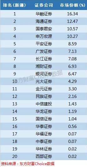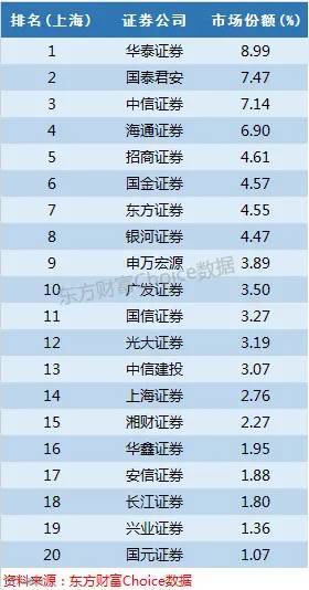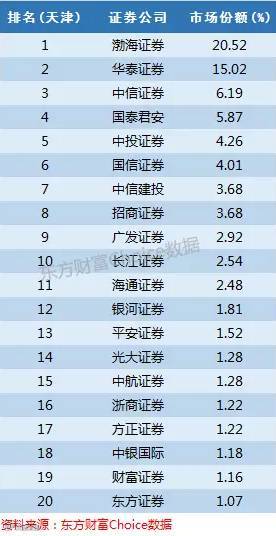 注册在天津滨海新区的渤海证券占据20.52%的份额,华泰证券15%也表现出色,另外中信证券和国泰君安以6%左右的份额可争夺前三。