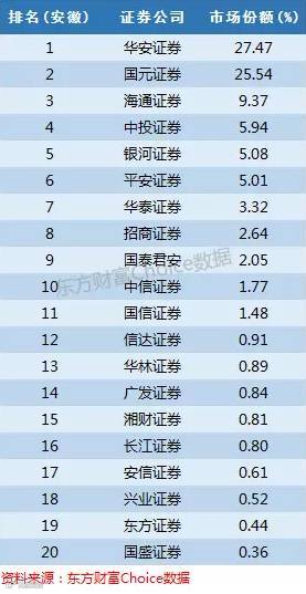 华安证券和国元证券都是安徽本地券商,为两大巨头,分别有27%和25%的市场份额,合计占据半壁江山。