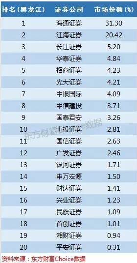 海通证券以31%的份额排名首位,原因在于接手了前本地券商兴安证券,江海证券则是本地唯一一家国有控股券商,市场份额20%。