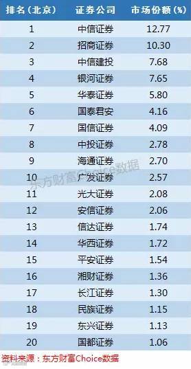 北京的证券市场竞争激烈,并没有具备绝对领先实力的公司,中信证券以12.77%的份额夺得头把交椅,招商证券以10.30%的份额次之,中信建投与银河证券市场份额都超过7%争夺探花之位,华泰证券以5.8%也占据五强席位之一,其余券商份额均未达到5%。