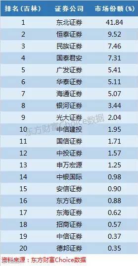 东北证券以前是吉林省证券,现市场份额为41.84%,牢牢掌控第一的位置,值得一提的是大本营在内蒙古的恒泰证券将市场拓展到了吉林,也获取了接近10%的份额排名第二。