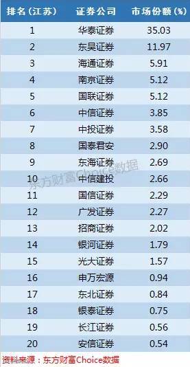 江苏市场由本地券商霸占,其中尤以华泰证券超过35%的份额最为惹眼,其次东吴证券也有近12%的份额引人注目,南京证券、国联证券同样是本地券商分别占据5.12%的份额,前五券商中只有海通证券杀入获取了5.91%的份额是非本地券商。