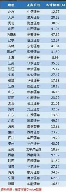 2. 证券行业越发达的地方越难以产生绝对龙头,北京、上海、广东三地排名第一的霸主市场份额都没有超过14%;相对而言欠发达的地区容易产生拥有绝对话语权者。