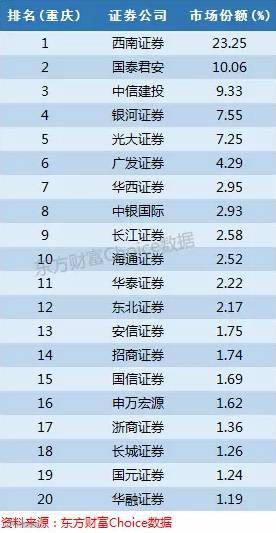 西南证券在重庆本地的实力毋庸置疑,占据市场份额23%,另外国泰君安和中信建投也有不错的表现。