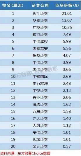 本地券商长江证券在湖北以21%的份额占据排行榜首位,华泰证券和广发证券也以超过10%的份额进入前三。