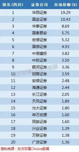 华西证券前身是四川证券,国金证券前身是成都证券,一下子就定义了两家券商在四川的市场地位,华西证券以接近20%的份额排名第一,国金证券以10%左右的份额排名第二。