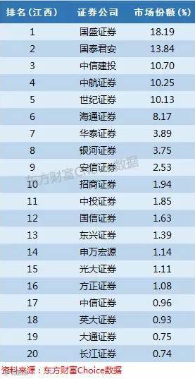 国盛证券是江西本地券商,占据市场份额18%,中航证券和世纪证券同样为本地券商,占据市场份额都为10%左右。