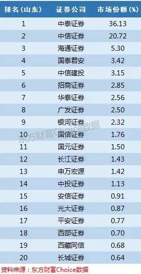 中泰证券前身齐鲁证券,一直是山东的豪强,占据市场份额36%排名第一,另外中信证券(山东),同样可以算作是本地券商,市场份额超过20%。