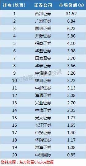 西部证券注册于陕西西安,是本地券商,市场份额超过31%,开源证券同样是陕西本地券商,市场份额为5.86%。