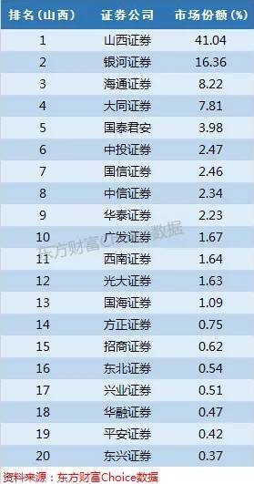 山西证券在山西无人可敌,超过四成的份额独霸山西,银河、海通也不错,还有一家本地券商大同证券也有7.81%的份额。