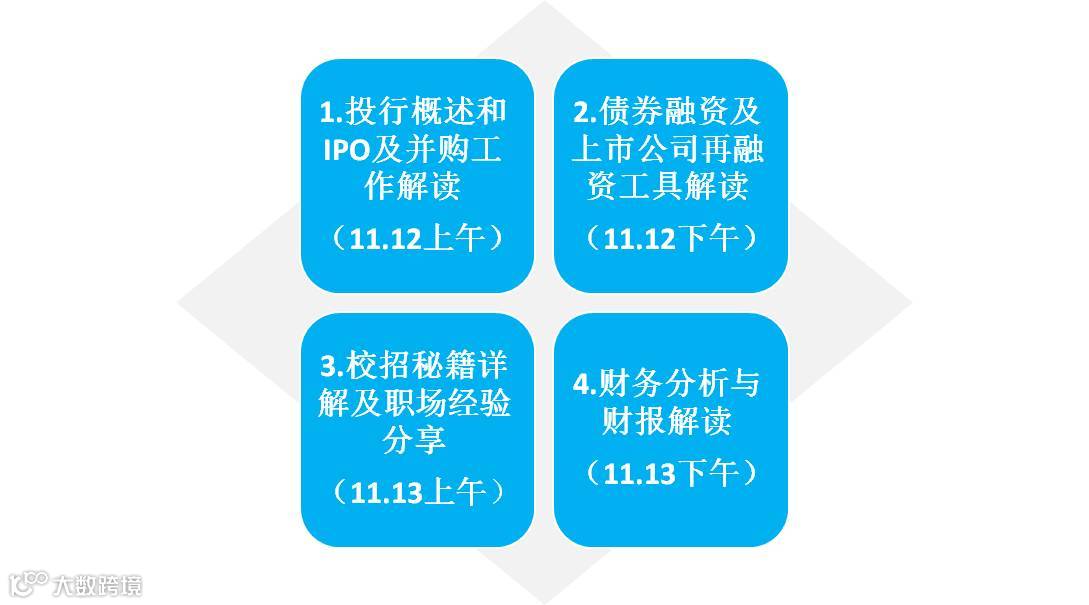 A:投行光靠读书不行哦,课程涉及到很多实务,这是课本学不到了,还会有笔试面试经验,也是课本没有的。而我们请来的嘉宾都是实战派的精英,带你直击投行前沿。