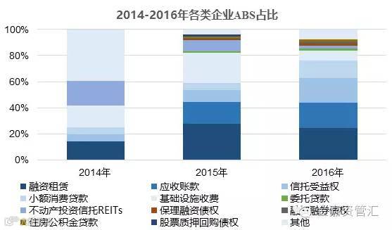 融资租赁、应收账款、信托受益权和小额消费贷款四类ABS产品占比逐年提高,已占据市场发行总额的76%,2016年同比增速有望突破150%。