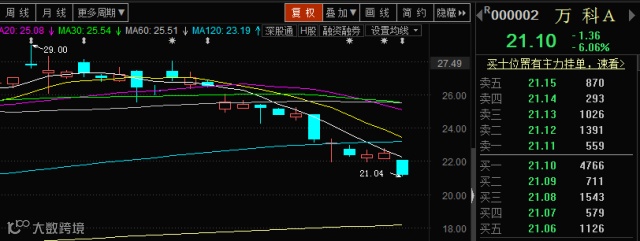 截止今天收盘,万科A股价已从29元的历史高位下跌至21.1元,跌幅已超过22%。