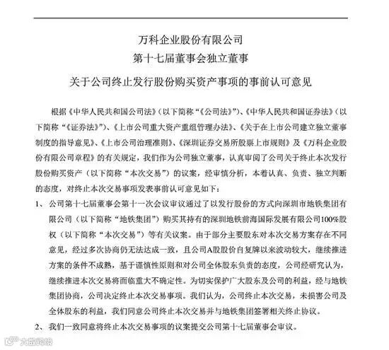 18日下午,万科发布关于终止发行股份购买资产事项的公告,称考虑到公司 A 股股价自复牌以来波动较大,当前各方对本次交易方案的调整尚无法达成一致意见,继续推进方案的条件不成熟。经与地铁集团协商,公司董事会同意公司终止本次交易事项。
