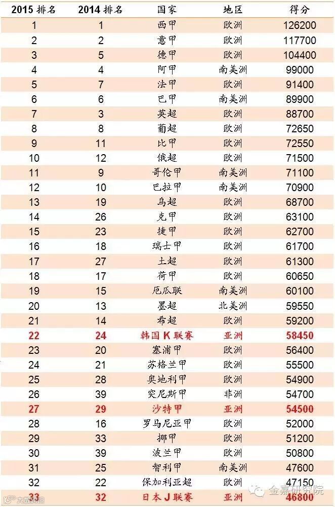 国际足球历史和统计联合会(IFFHS)综合上座率、球员薪资、商业价值等因素,发布了2015年世界各大足球联赛排名,其中亚洲仅韩国、沙特、日本上榜。结合IFFHS、英国《每日邮报》、PLURI等各种机构公布的世界各国联赛排名中,位居世界前列的是欧洲五大联赛英超、德甲、西甲、法甲和意甲。即使从联赛上座率来看,欧洲足球的群众基础也在世界领先。在亚洲范围内,商业价值和关注度居前的联赛主要有日本J联赛、中超、韩国K联赛等。
