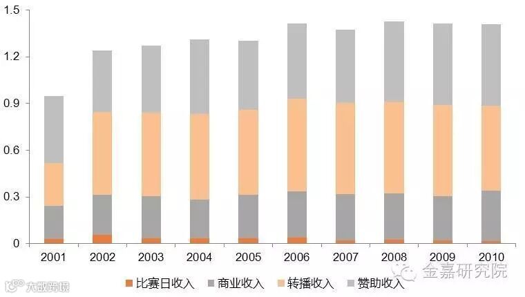 日本J联赛2001-2010年收入构成(亿美元)