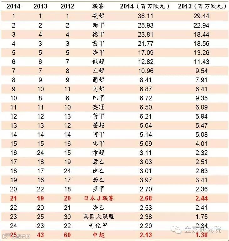 PLURI发布的2014联赛价值排行榜